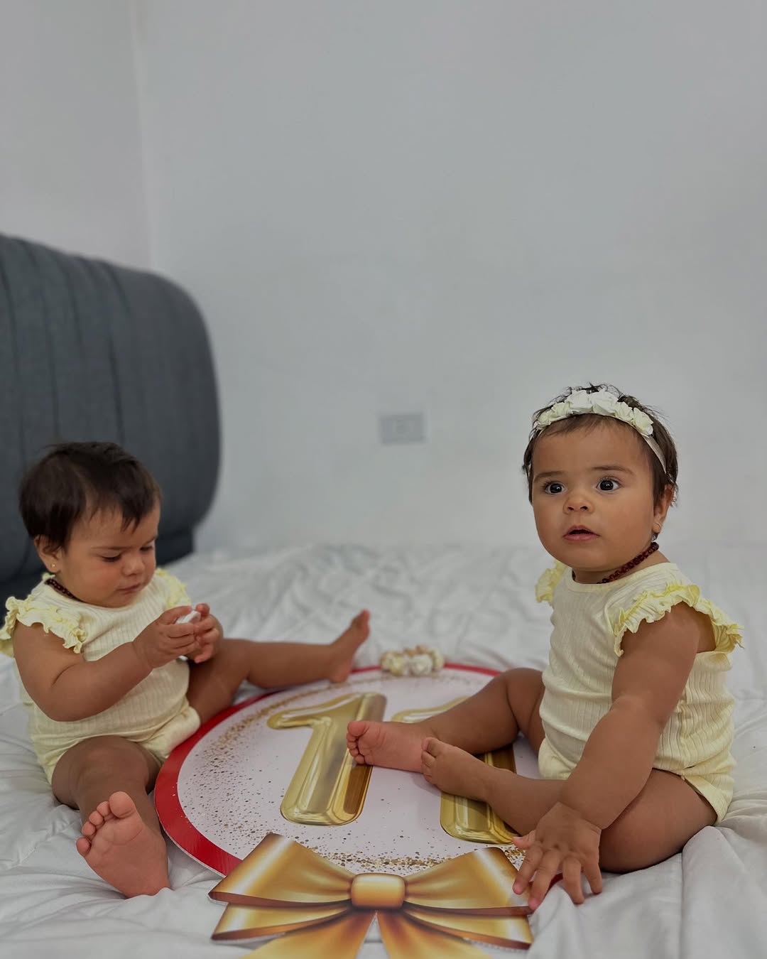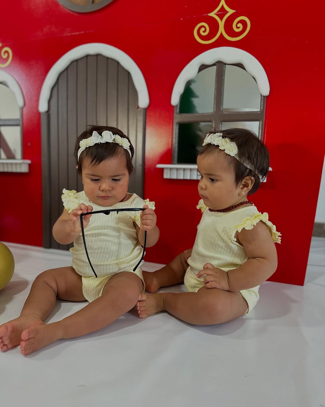En cuanto al look de las gemelas, ambas llevaron bodys en tono amarillo con volados y una vincha con flores haciendo juego. Este estuvo relacionado a uno de los colores de la Navidad y que también representa positividad. Además, lucieron sus respectivos collares de ámbar que les ayuda con la las molestias de la dentación.