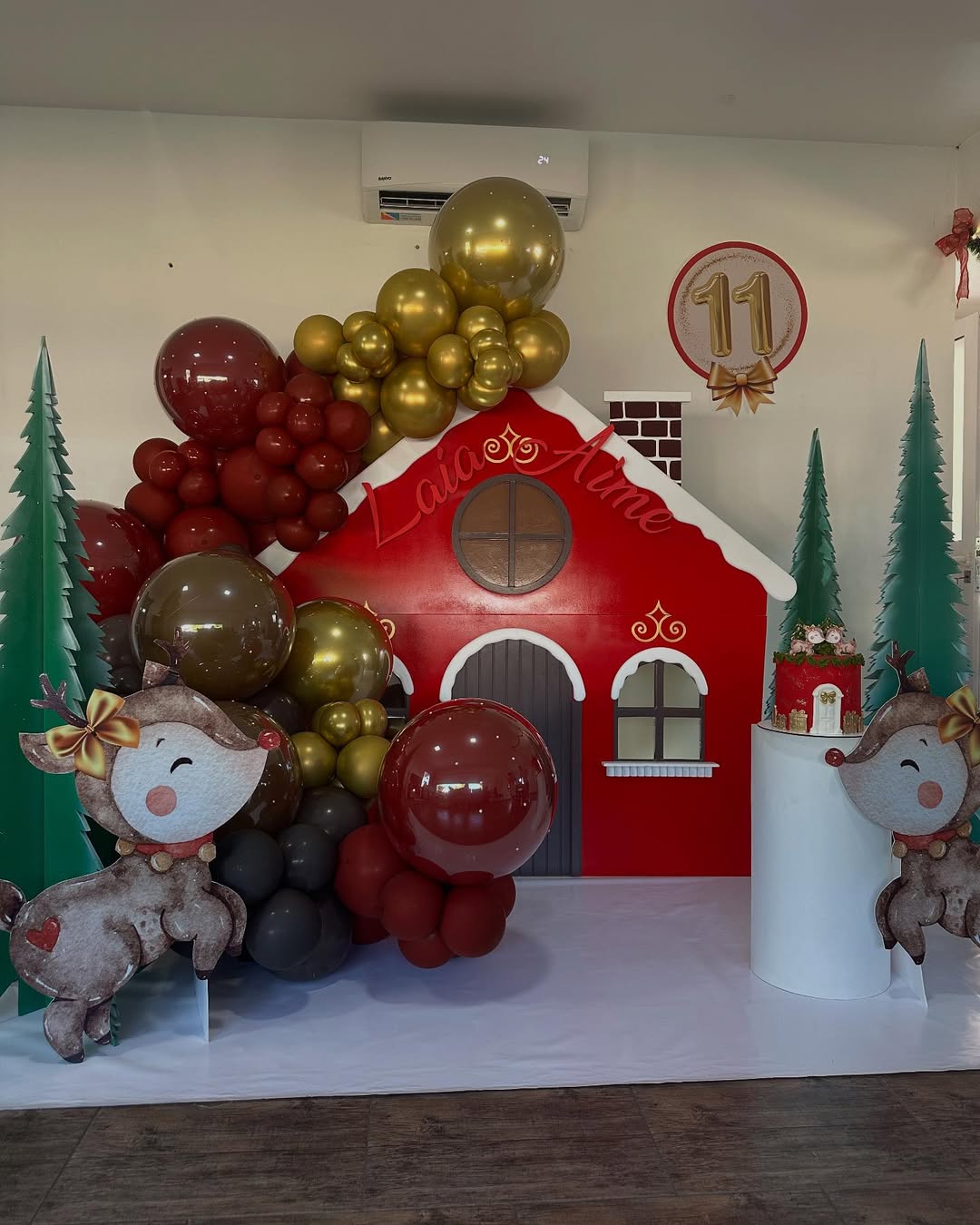 Con una decoración donde predominaron los globos rojos, dorados y marrones, las pequeñas recibieron su fecha especial. Como se puede ver en las fotos compartidas, tuvieron una torta caracterizada por muérdagos, renos, pinos y casas con nieve.