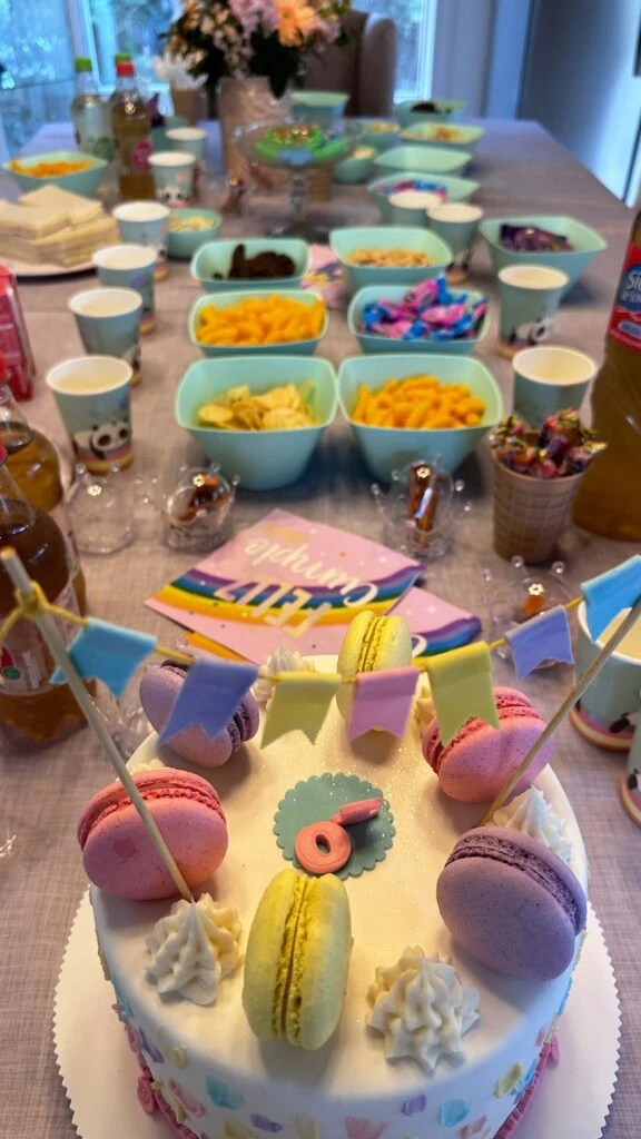 En cuanto a la torta temática que encargó Nicole Neumann para su hija, hay que destacar que se trató de un pastel de un solo piso, con detalles multicolores sobre un fondo de color manteca y el agregado de alfajorcitos macarons.