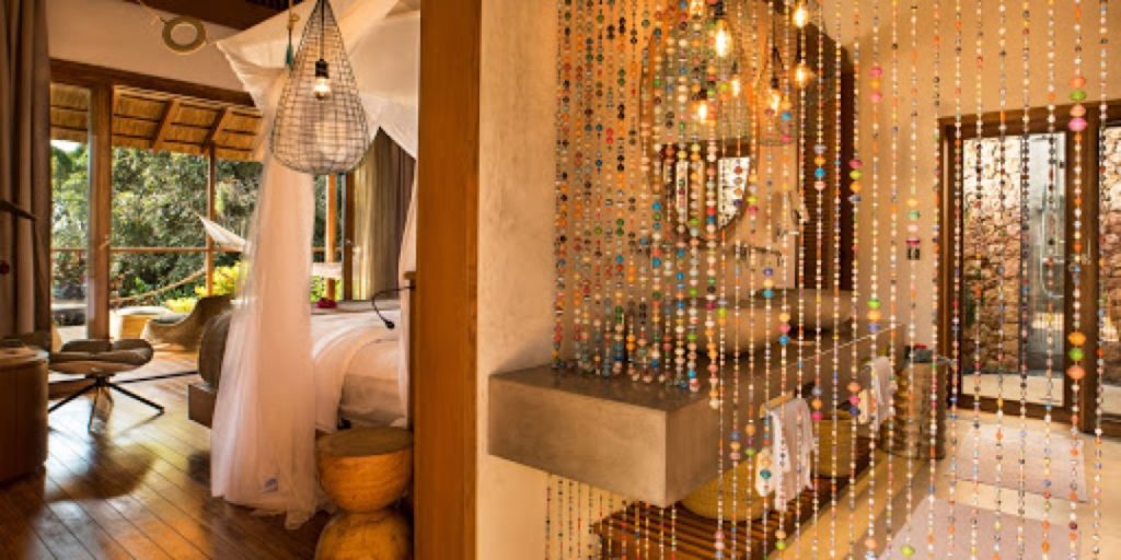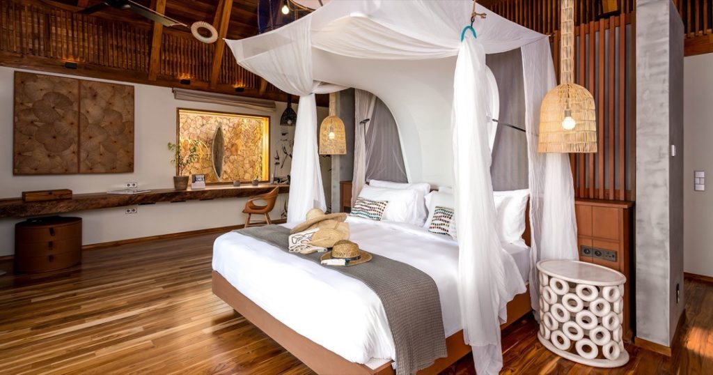Los detalles de diseño de interiores añaden más interés, como muebles únicos elaborados con la madera desgastada de los dhows antiguos, cortinas de cuentas de colores hechas por artesanos locales y accesorios de iluminación que se mueven con la brisa como linternas de papel.