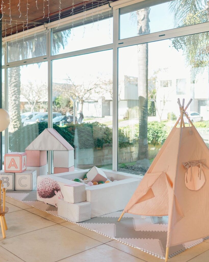 La mesa dulce estuvo conformada por paletas, galletitas, cupcakes, entre otras delicias, mientras que la torta de dos pisos contó con decoración floral y figuras de animales. El mobiliario infantil consistió en mesas y sillas de madera, hubo mini carpas, peloteros y juegos de estilo Montessori.