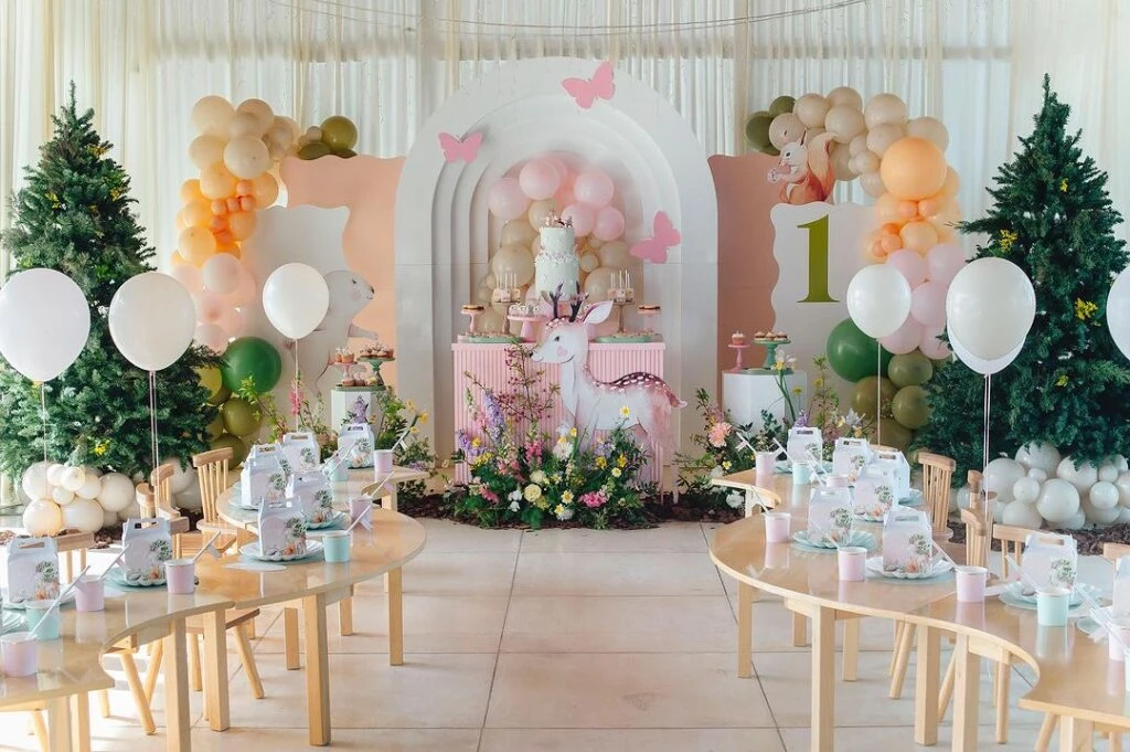 La ambientación contó con varios arreglos florales y hasta dos pinos grandes, con imágenes de ciervos, conejos, ardillas y otros. Además, hubo globos en color rosa pastel y dorado, con algunas tiernas figuras de mariposas.