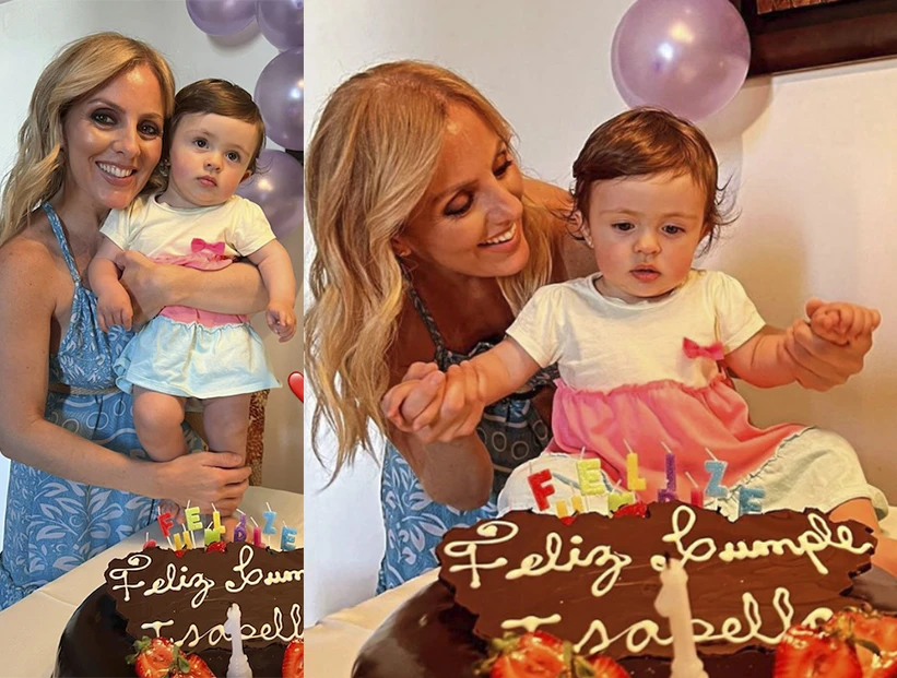 "Feliz cumple Isi", se lee en las imágenes que la pareja compartió, donde la pequeña posa tanto con su mamá como con su papá y sus abuelos frente a la torta con baño de chocolate y decorada con frutillas.