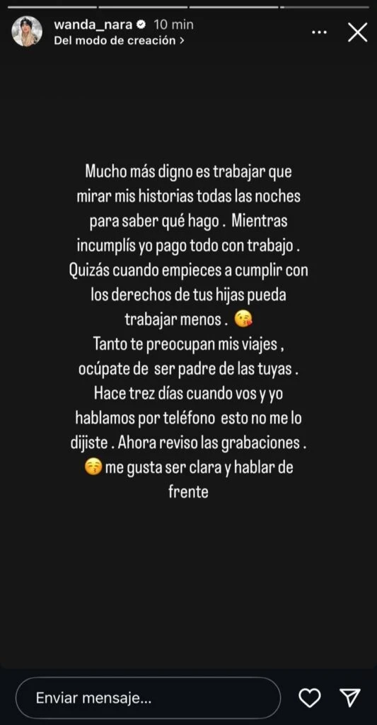 En las últimas horas, Wanda realizó un nuevo descargo, refiriéndose a las críticas de la defensa de Icardi sobre sus viajes y actividades laborales. En sus historias de Instagram, a través de un fondo negro con letras blancas expresó: "Mucho más digno es trabajar que mirar mis historias todas las noches para ver qué hago. Mientras incumplís, yo pago todo con trabajo. Quizás cuando empieces a cumplir con los derechos de tus hijas pueda trabajar menos."