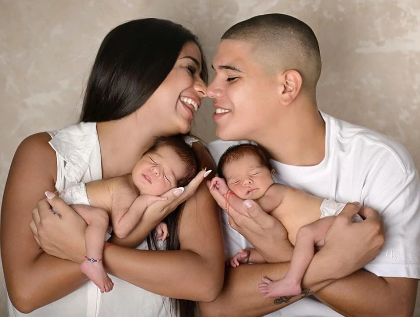 "SOMOS GEMELAS! 🧸🧸. Mami y papi nos hicieron estas fotitos, estamos muy felices de que oficialmente nos puedan conocer y acompañar en toda esta nueva aventura 💕", comenzaron escribiendo Thiago y Daniela en el posteo donde decidieron mostrar las fotos de sus hijas.
