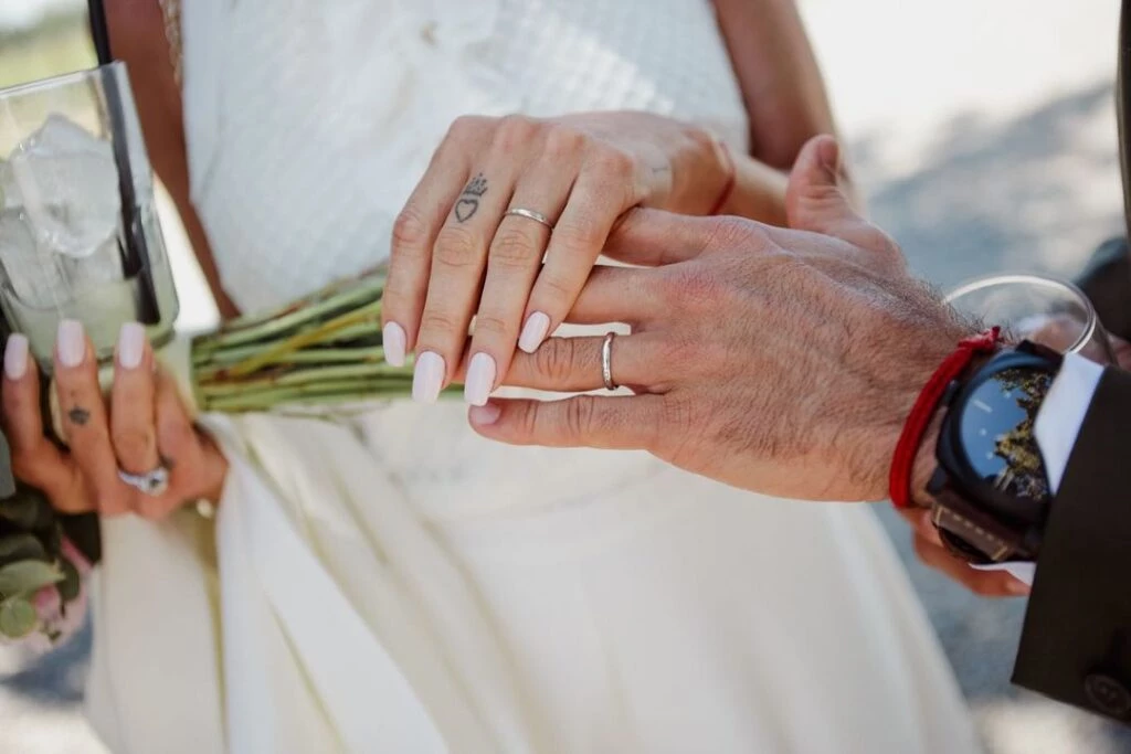 En primer plano, las manos de los novios, cuando ya eran marido y mujer.