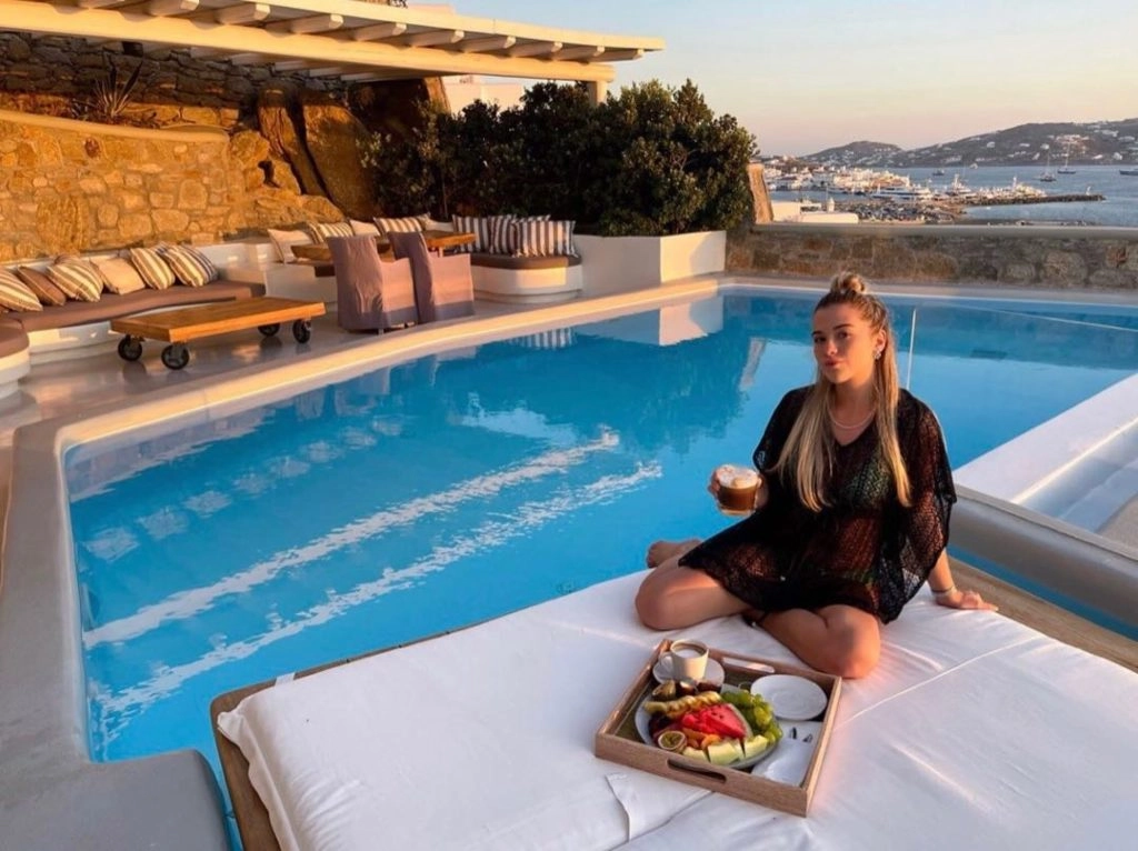 La pareja se hospeda en un resort de lujo situado junto al Mar Egeo que se llama Cavo Tagoo Mykonos, a 10 cuadras del centro de la isla y muy pocos metros de la playa. El hotel cuenta con un restaurante, spa, gimnasio, y servicios como el alquiler de yates, viajes en helicóptero, un chófer personal, eventos especiales, un fotógrafo personal y tours privados por la isla.