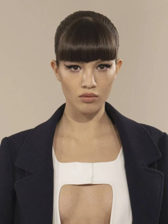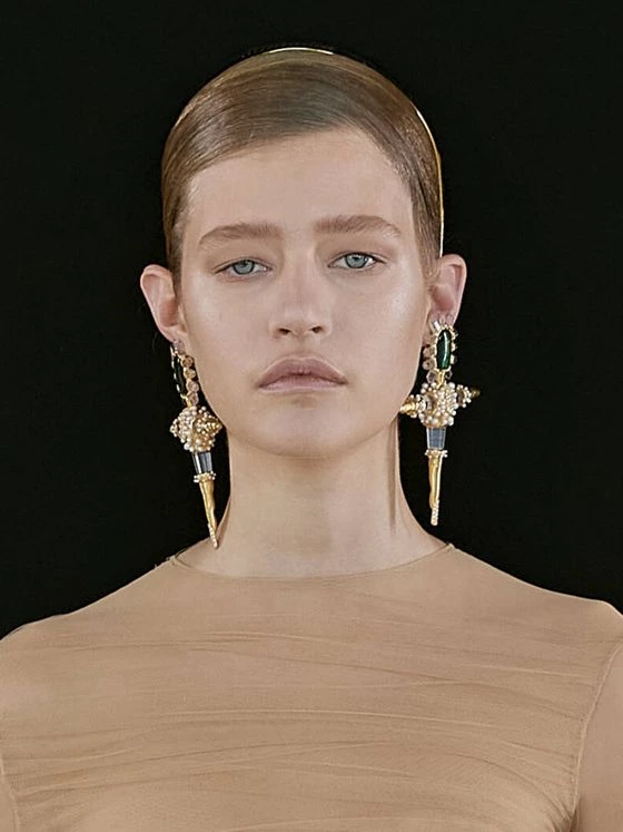 En la reivindicada importancia de la mirada, también cabe destacar la omnipresencia de las pestañas postizas. Una vez superadas las extensiones de pestañas que restaban la naturalidad etérea que siempre se espera de la Haute Couture, la estrategia para sumar volumen y dramatismo, permitiéndose incluso prescindir del delineado, pasa por el uso de las pestañas postizas, si bien no discretas, convertidas en el único accesorio.