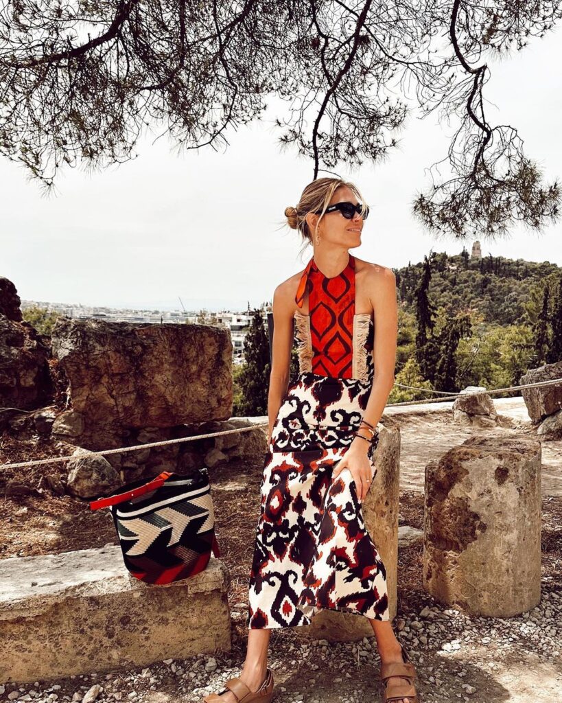 La pareja se fotografió frente a este increíble monumento y por supuesto, Carla no dejó de lucir su lado más fashionista. Lució un vestido largo sin mangas y estampado, detalle de flecos en la parte superior del vestido y cuello halter, y combinó con sandalias Prada.