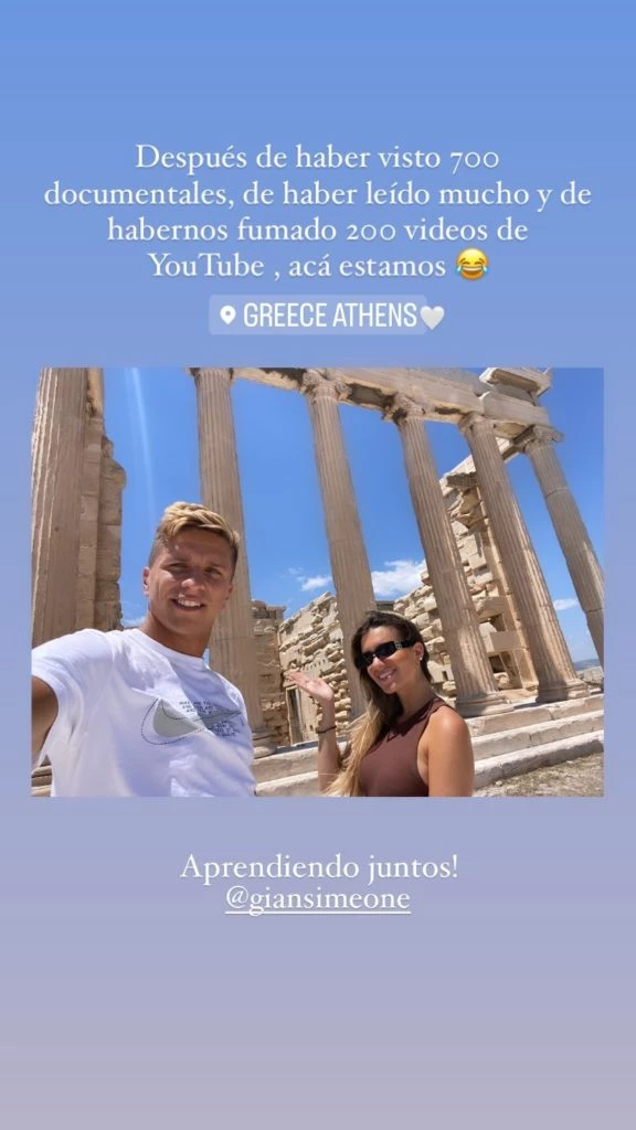 Gianluca Simeone, uno de los hijos de Carolina Baldini y el Cholo Simeone, está de vacaciones en Grecia junto a su novia, Abril Bruzzese. Y aunque están muy felices por recorrer el país que tanto anhelaban, la joven de 21 años reconoció que no está pasando su mejor momento luego de que el lunes se incendiara por completo la casa de sus padres en Argentina.