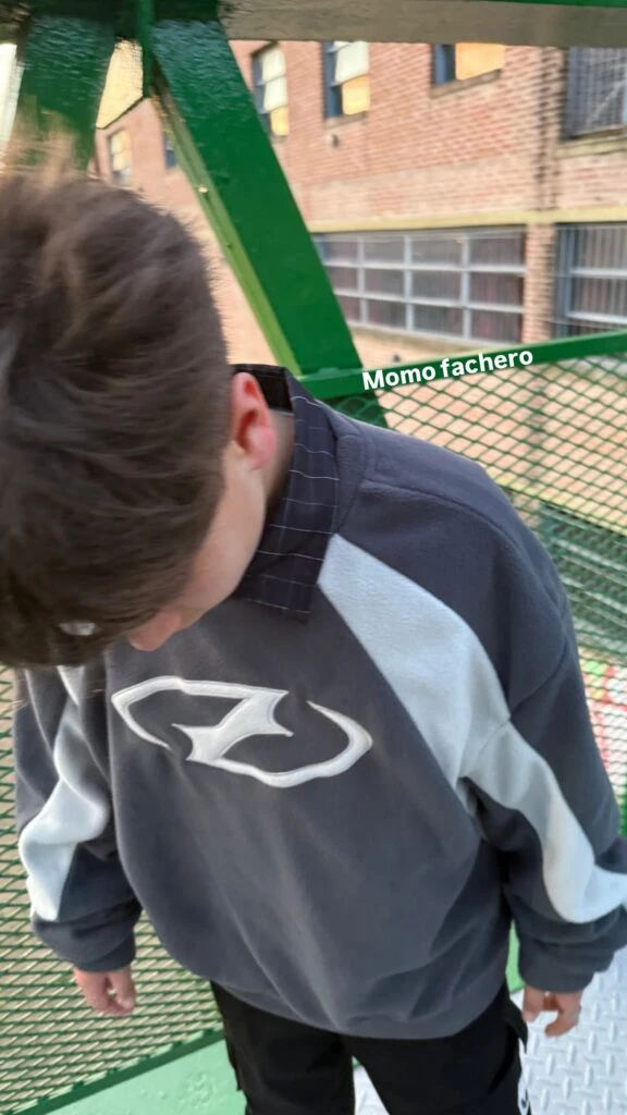 Todo comenzó con un paseo familiar. Jimena compartió primero una foto de Momo, su hijo mayor, posando con un buzo gris a rayas blancas. “Momo fachero”, escribió orgullosa.