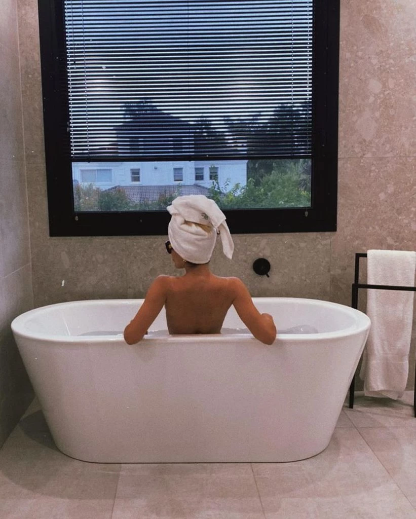 Con porcelanato gris en el piso y las paredes, sin dudas que la gran protagonista es la bañera blanca ovalada que colocó debajo de un ventanal con marco negro que aporta carácer.