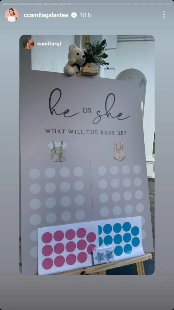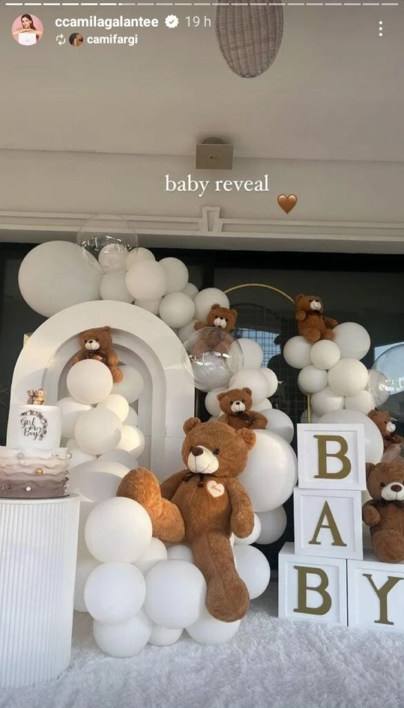 En las imágenes se puede ver a la familia junto a una gran caja blanca que anunciaría si es nena o varón. La decoración contó con grandes osos de peluches, globos blancos y hasta una torta con tonos neutros y unos ositos. Además, hubo juegos para los invitados donde debían adivinar el sexo del bebé.