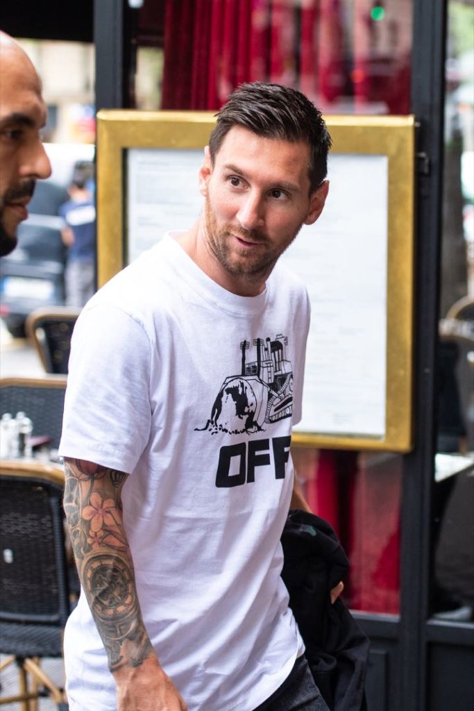 En tanto que Lionel prefirió jeans gastados negros y remera blanca, más calzado deportivo al tono y buzo oscuro sobre los hombros.