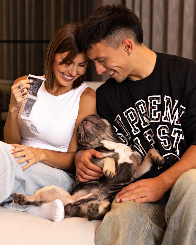 Y cerraron: "¡¡¡Gracias por elegirnos!!! Te aman con el alma entera… Mamá y Papá. Y por supuesto también te espera con muchas ansias el perrito con el corazón más puro del mundo". En el posteo ambos posan junto a la primer ecografía de su bebé y también con "Polito", su querida mascota.