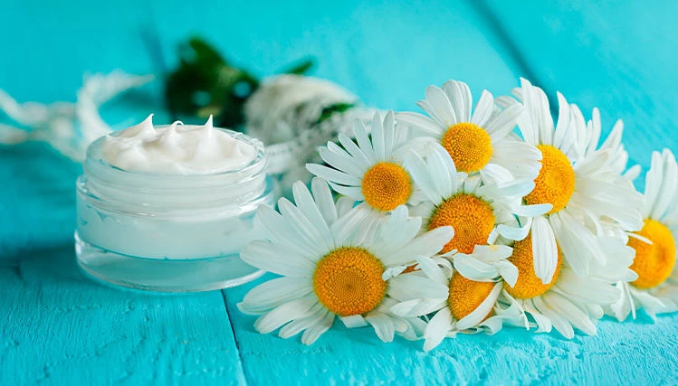Para la piel: ayuda a restablecer el pH de la piel, estabilizando y minimizando su sensibilidad. Tiene una capacidad reparadora y cicatrizante, además es antiinflamatoria y calmante. Además, ayuda a la cicatrización de heridas. Por estos motivos, vas a encontrar cremas faciales y corporales que contengan manzanilla.