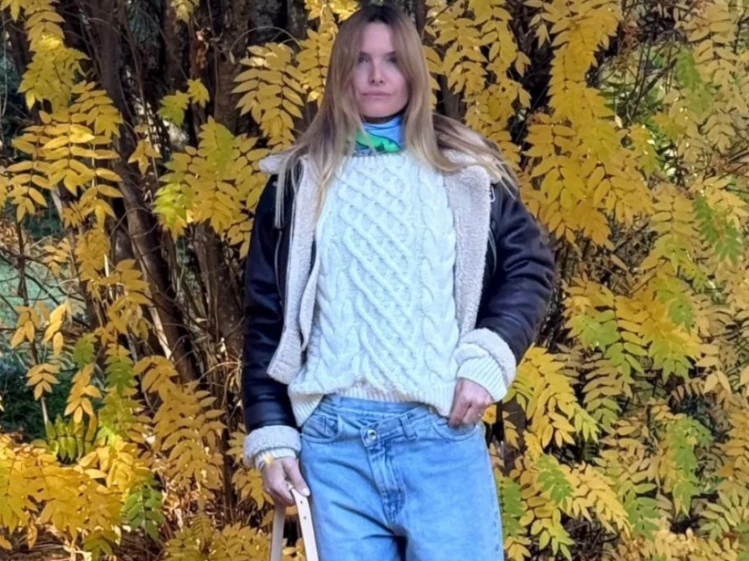 Uno de los estilismos más destacados fue el que combinó un suéter blanco con jean oversized y una campera de cuero negra con corderito. Sumó un pañuelo celeste estampado y una cartera acolchonada, logrando un look funcional y canchero para recorrer la ciudad.