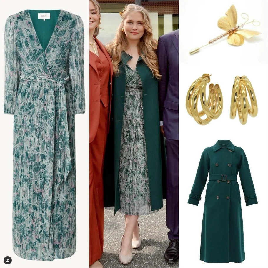 La mayor, Amalia, llevó un vestido de seda con estampa botánica en tonos verde y blanco de Bash Paris, más un tapado liviano en tono verde oscuro de Max Mara. Completó su estilismo con stilettos clásicos en tono nude, más broche en forma de mariposa y aros en color dorado.