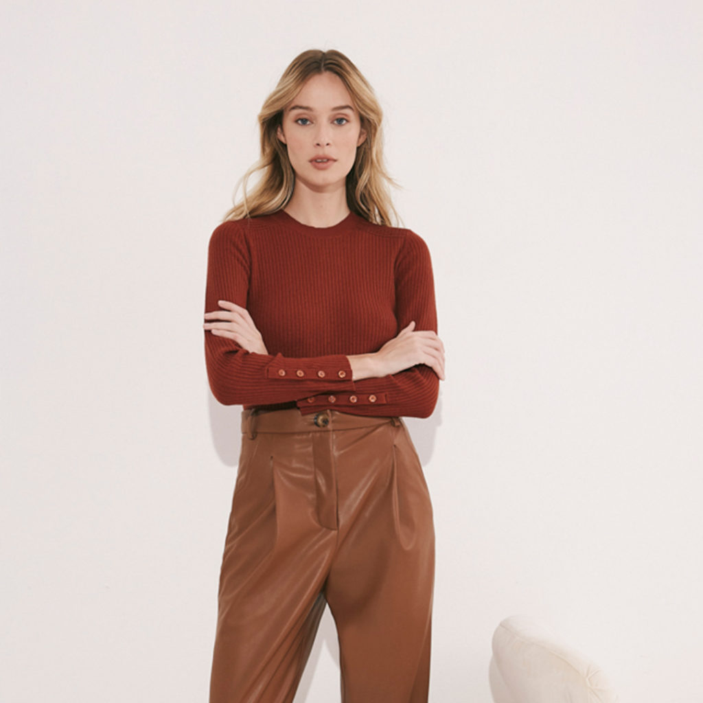 - Work day: pantalón marrón de corte clásico con botas y suéter en tonos similares.