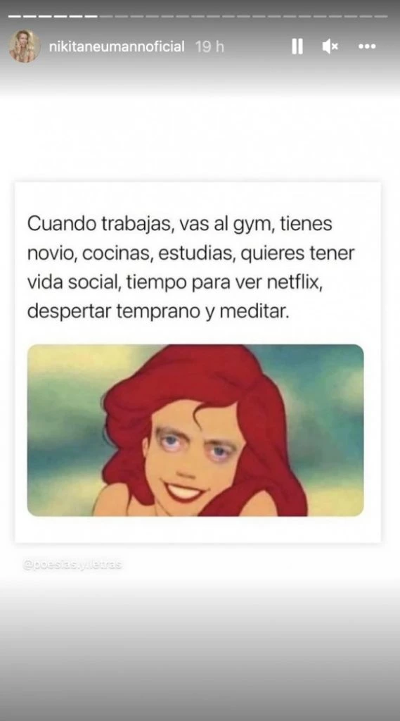 En la imagen se la ve a la Sirenita con ojeras y con cierto cansancio. Además, enumera todas las acciones que realiza a diario, con las cuales la panelista se sintió identificada: "Cuando trabajás, vas al gym, tenés novio, cocinás, estudiás, querés tener vida social, tiempo para ver Netflix, despertar temprano y meditar".