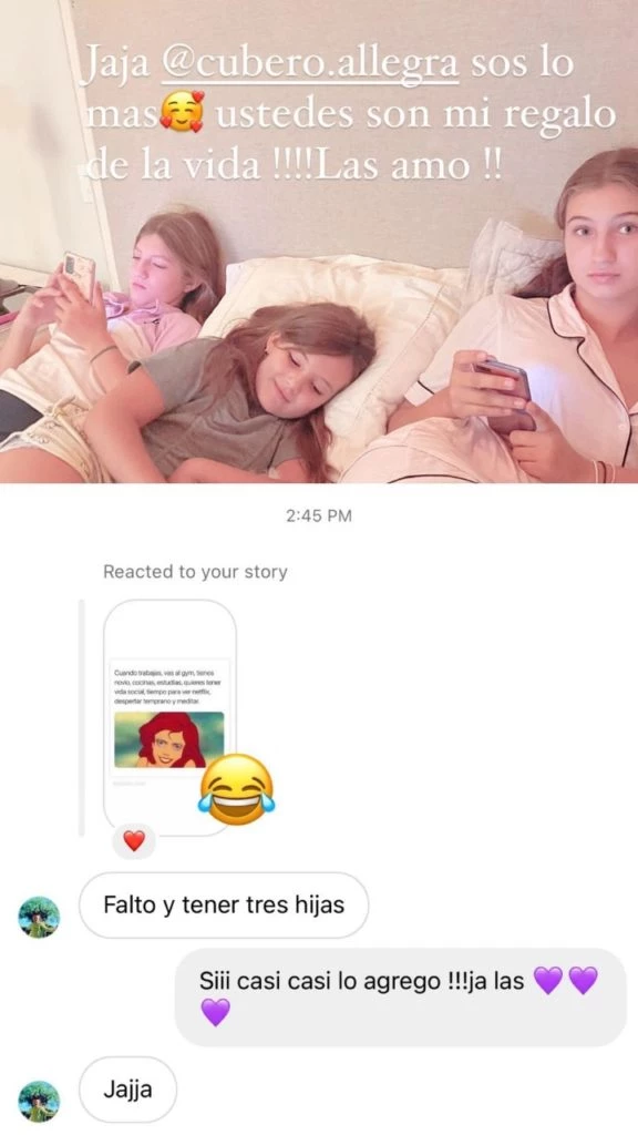 Sin embargo, su publicación no cayó para nada bien en una persona muy cercana a ella ya que no nombró su rol de madre. Se trata de Allegra, la segunda hija que tuvo con Fabián Cubero, quien no dejó pasar la ocasión para reprocharle que se olvidó de ella y sus hermanas. "Te faltó escribir 'tener tres hijas'".
