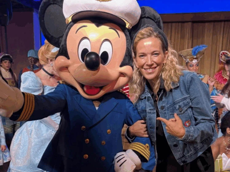 En otra imagen, con un guiño de humor y nostalgia, escribió: “Y acá, otra niña feliz”, al mostrarse sonriendo al lado de Mickey vestido de marinero. Su expresión de alegría y su gesto señalándolo dejaron entrever cuánto disfruta ella también de este mundo encantado.