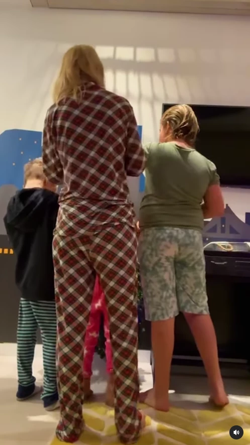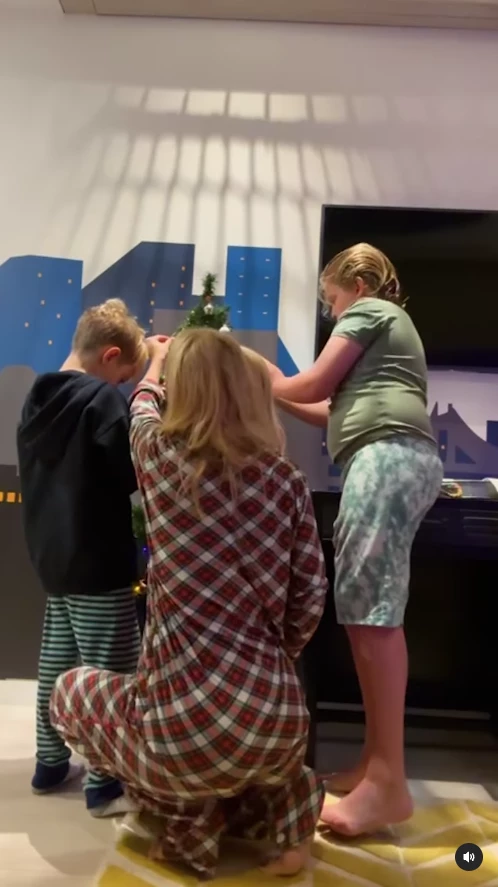 La actriz está junto a sus cuatro hijos, los pequeños Noah, Elías, Vida y Cielo Buble, a quienes se lo ve colgando adornos en dos arbolitos navideños, ubicados cada uno en un sector distinto de la casa.