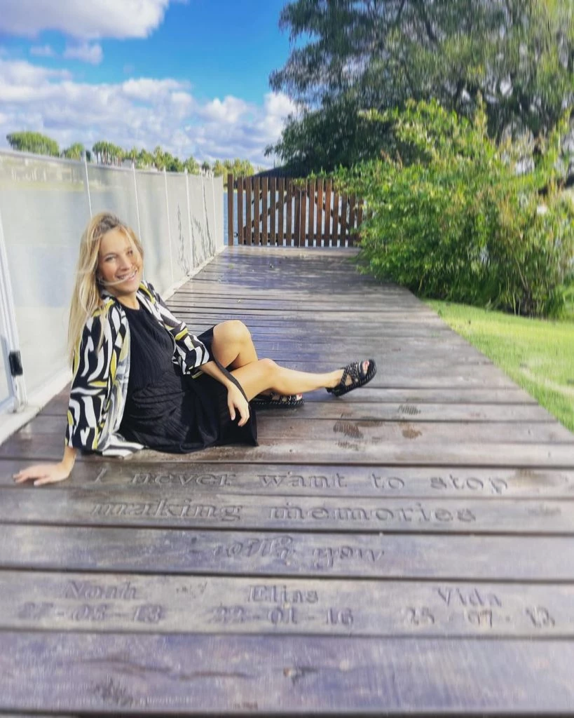 "No quiero parar de hacer recuerdos", se puede leer en inglés en estas tablas de madera que decoran el piso del jardín de su casa en Nordelta. Lopilato aparece posando de espaldas a una pileta que está cercada para la seguridad de sus niños donde hay varios árboles y arbustos que rodean el patio familiar y un lago que pertenece al barrio privado.
