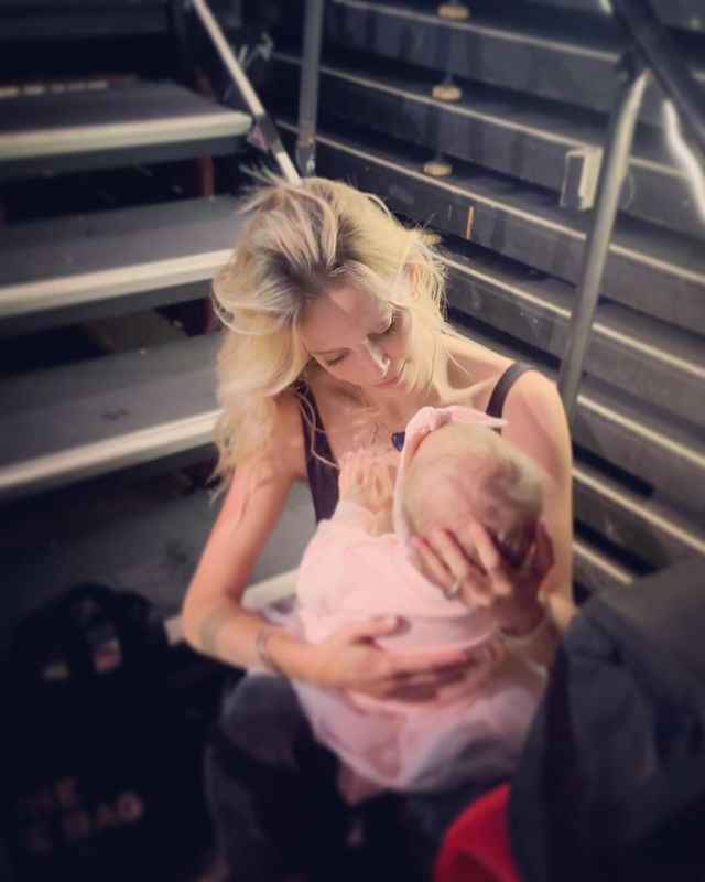 En un reciente posteo, la actriz se mostró a un costado del escenario atenta al show de su esposo y junto a su bebita de casi un año.
