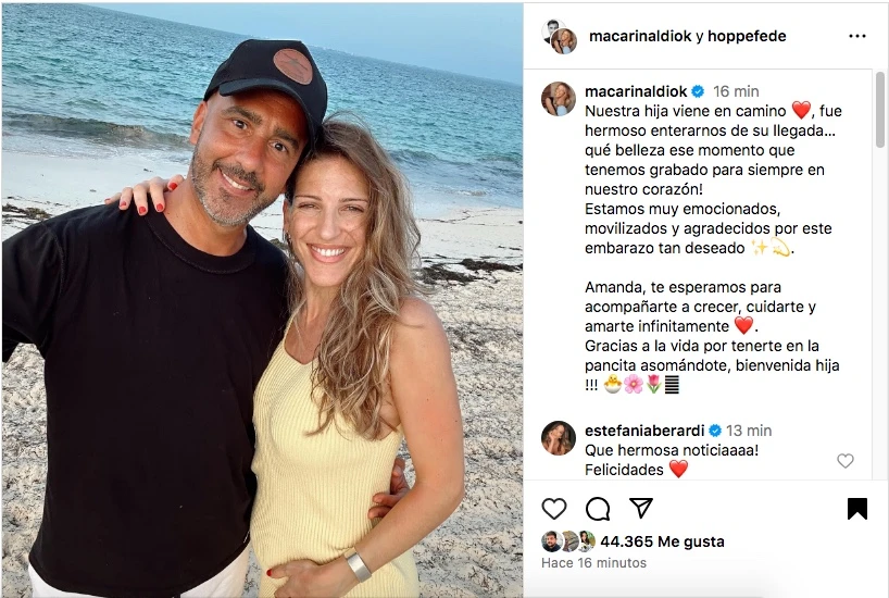 "Estamos muy emocionados, movilizados y agradecidos por este embarazo tan deseado", agregó. Además, la pareja ya confirmó el sexo y el nombre de su futuro bebé. "Amanda, te esperamos para acompañarte a crecer, cuidarte y amarte infinitamente. Gracias a la vida por tenerte en la pancita asomándote, bienvenida hija", aseguró.