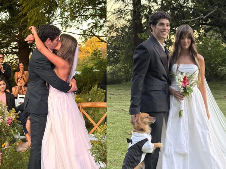 En el civil, celebrado el 11 de noviembre, Malena apostó por un look moderno y urbano: blazer oversize bordado con strass, short al tono y sandalias glitter. Un estilo juvenil y relajado que contrastó con la ceremonia religiosa, donde la actriz brilló con un vestido clásico y sofisticado, demostrando su versatilidad y buen gusto para distintos formatos nupciales.