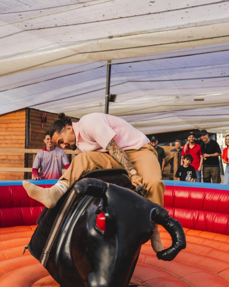 Entre los juegos, hubo un toro mecánico que no le "perdonó la vida" ni siquiera a Maluma.
