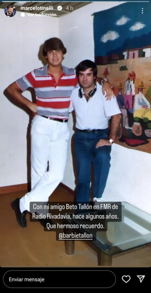 Mientras cuenta, ansioso, los días para su regreso en El Trece, el conductor se mostró nostálgico en sus historias de Instagram. Junto a una foto vintage de la época en la que se desempeñaba como periodista radial en Radio Rivadavia, Tinelli escribió: "Con mi amigo Beto Tallón en FMR de Radio Rivadavia hace algunos años".