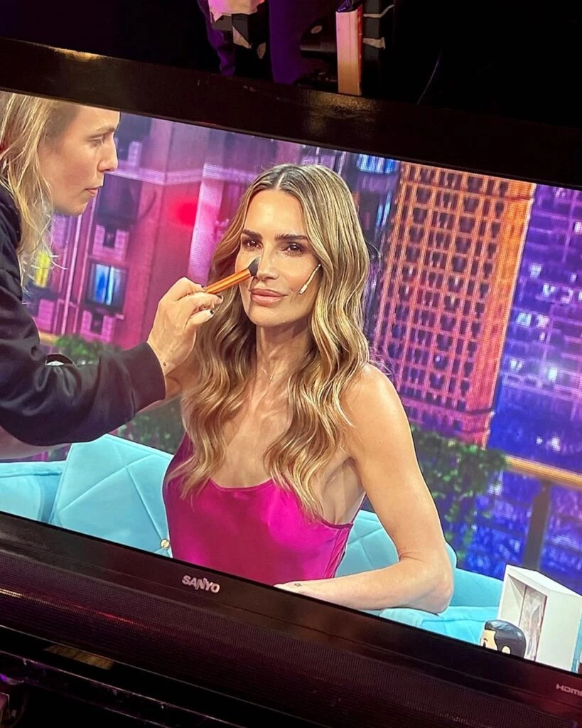 Para el programa María Vazques lució un sensual slip dress de saten en coor fucsia del El Camarín. Un diseño simple de largo midi que tenía de protagonista una una profunda abertura en la espalda.