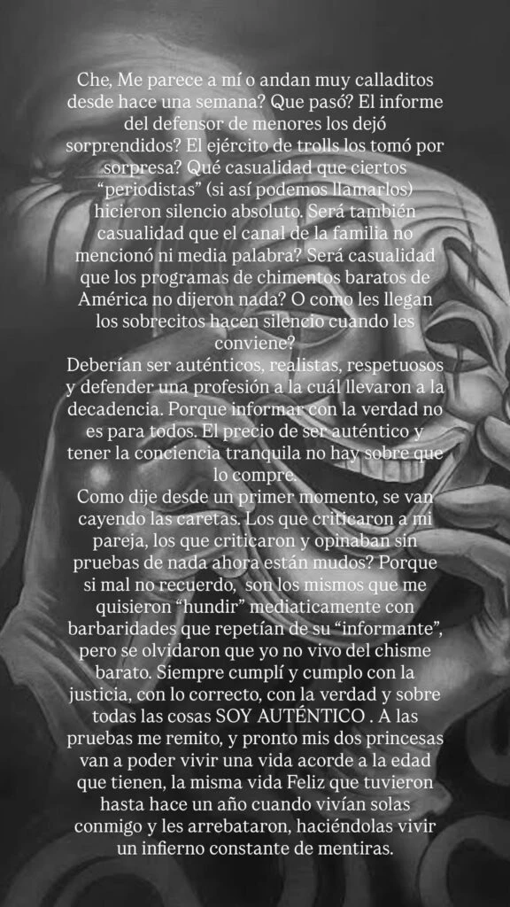 El futbolista continuó su descargo apuntando directamente a periodistas y programas de espectáculos: “Qué casualidad que ciertos ‘periodistas’ hicieron silencio absoluto. ¿Será también casualidad que el canal de la familia no mencionó ni media palabra? ¿O que los programas de chimentos baratos de América callaron? Como les llegan los sobrecitos, hacen silencio cuando les conviene”, disparó con dureza.