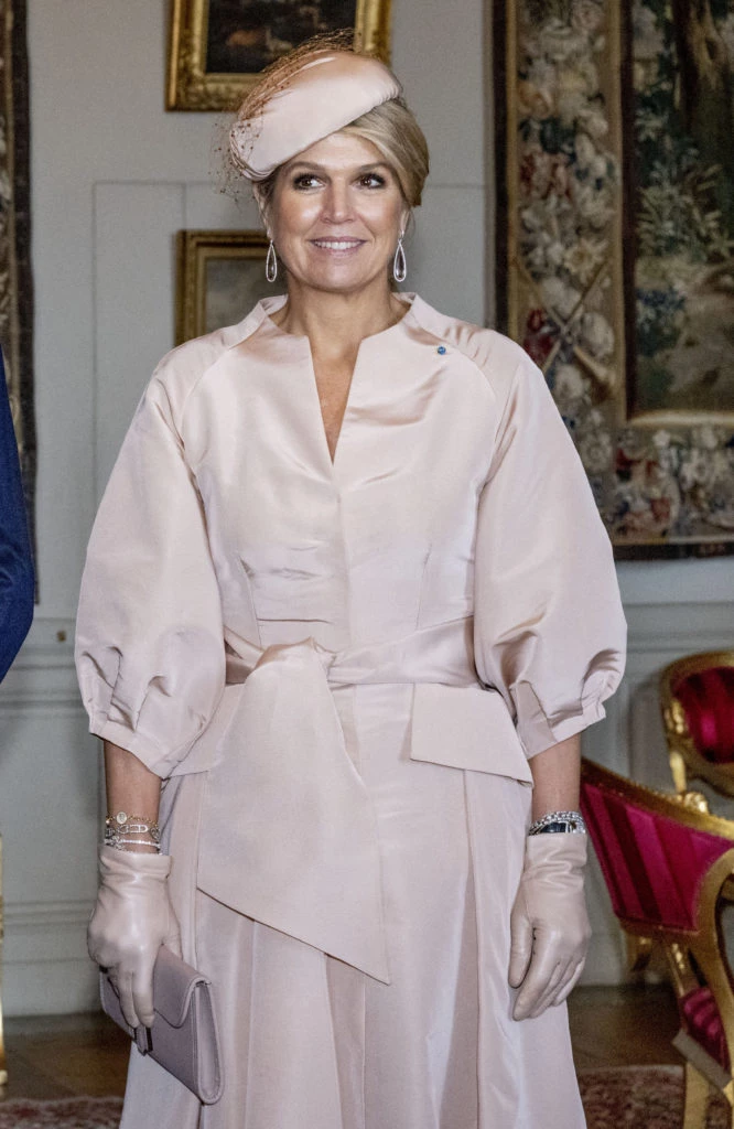Máxima eligió un diseño en color rosa pastel de Natan, con mangas globo abullonadas, falda midi y cinturón ancho, con una lazada XXL. Haciendo juego, apostó por un nuevo tocado tipo casquete con detalle de tul y salpicado con pedrería. Cubrió sus manos con guantes al tono.