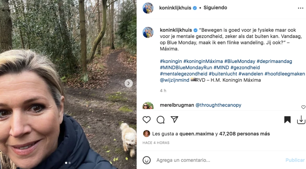 Mediante un selfie junto a su mascota en el campo, Máxima compartió un texto que hace referencia a este particular "Blue Monday". "El ejercicio es bueno para la salud física, pero también para la mental, sobre todo si se puede hacer al aire libre. Hoy, en el Blue Monday, voy a dar un largo paseo. ¿Vos también?", escribió.