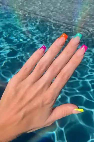 La manicura de la actriz, que es una francesita invertida, realizada en los colores de la bandera LGBTTTIQ+ con base de uña transparente, es una de las tendencias beauty del momento.