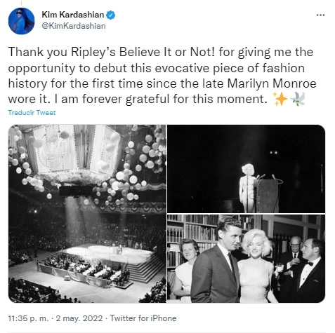 Luego, agradeció al museo donde se conserva la prenda desde que fue adquirida en subasta por 4,8 millones de dólares en 2016: "¡Gracias Ripley's Believe It or Not! por darme la oportunidad de estrenar esta pieza evocadora de la historia de la moda por primera vez desde que la difunta Marilyn Monroe la usó. Estoy eternamente agradecida por este momento".