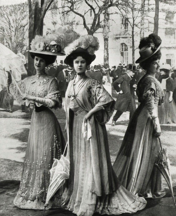 Los colores elegidos seguían los tonos de las joyas: dorados, plateados, con destellos de colores vivos imitando al de las piedras preciosas. Los tonos claros eran solo para usar de entrecasa y de ninguna manera eran los indicados para caminar por las calles de la ciudad. Los sombreros eran imprescindibles para salir y, generalmente, se los adornaba con plumas.