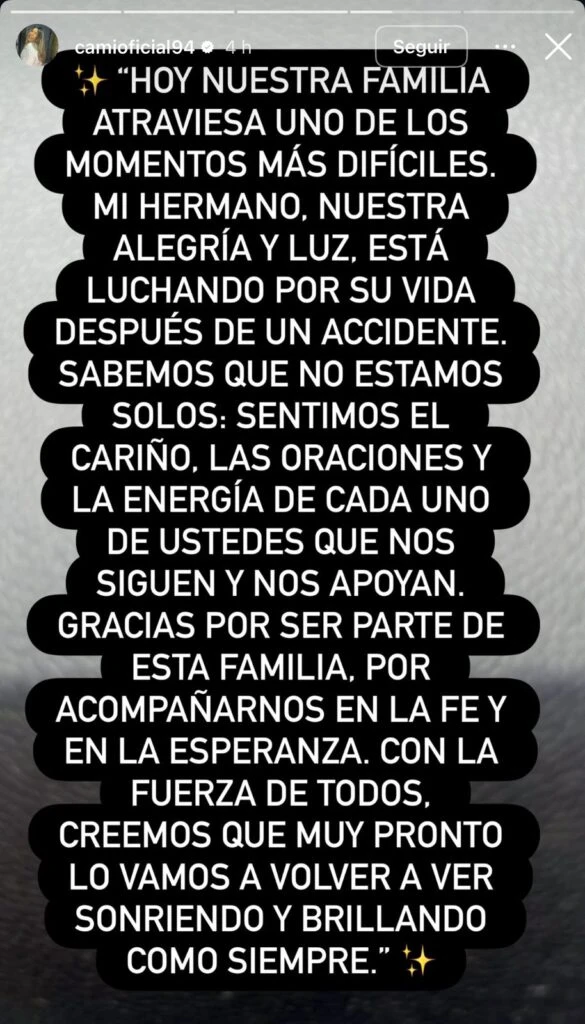 “Hoy nuestra familia atraviesa uno de los momentos más difíciles. Mi hermano, nuestra alegría y luz, está luchando por su vida después de un accidente. Sabemos que no estamos solos: sentimos el cariño, las oraciones y la energía de cada uno de ustedes que nos siguen y nos apoyan”, escribió con profunda emoción.