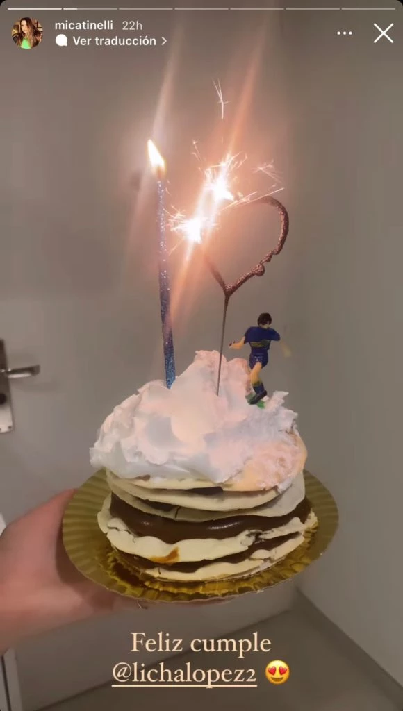 Con una torta que tenía la figura de un jugador de fútbol, Mica le dio la bienvenida a este miércoles para que López sople las velitas después de la medianoche. Entrada la tarde, mostró cómo siguieron los festejos: decoró el departamento con globos con forma de camiseta de Boca, pelotas y las figuras numéricas del 32. “Miren lo buena novia que soy”, dijo.