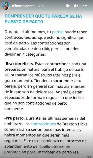El posteo de Viciconte termina con un último material donde se explica cómo reconocer las contracciones de parto, tema en el cual su pareja ya debería estar experimentado luego de haber acompañado a su primera mujer, Nicole Neumann, en los nacimientos de sus tres hijas mayores.