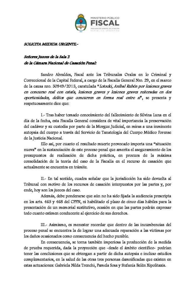 "Tras haber tomado conocimiento del fallecimiento de Silvina Luna en el día de la fecha, esta Fiscalía General considera de vital importancia la preservación del cadáver y su custodia por parte de la Morgue Judicial, con miras a una inminente autopsia del cuerpo (...)", se indica en el escrito.