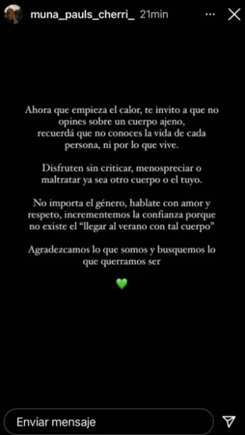 "Ahora que empieza el calor, te invito a que no opines sobre un cuerpo ajeno. Recordá que no conocés la vida de cada persona, ni por lo que vive", comenzó escribiendo la joven en sus Historias de Instagram.