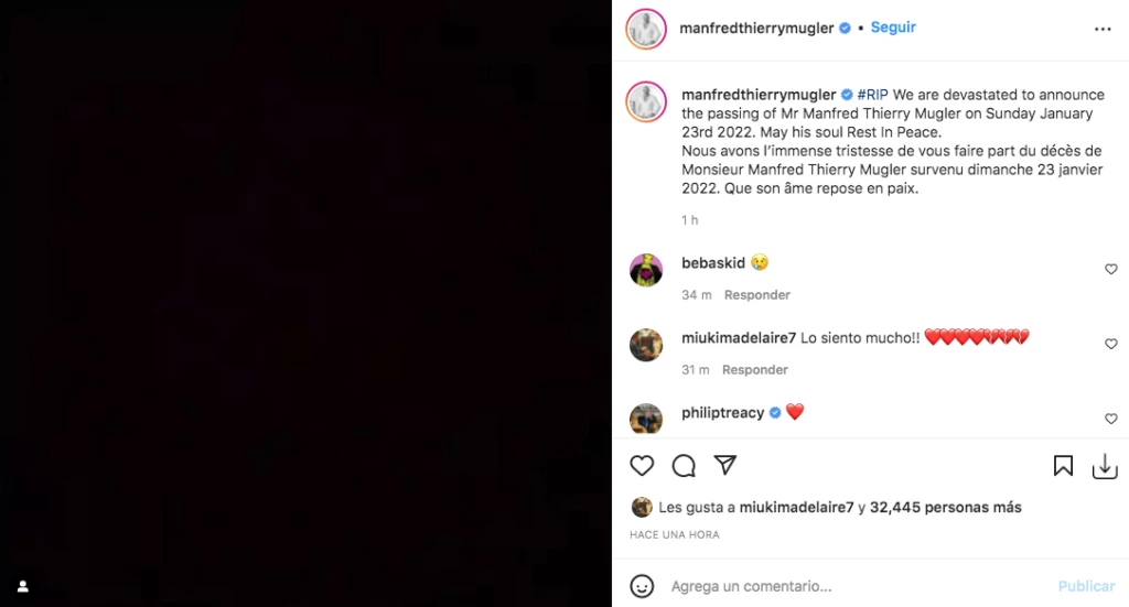 La información fue confirmada desde la cuenta de Instagram del diseñador con un breve mensaje: "#RIP Estamos devastados de anunciar el fallecimiento del Sr. Manfred Thierry Mugler el domingo 23 de enero de 2022. Que su alma descanse en paz".