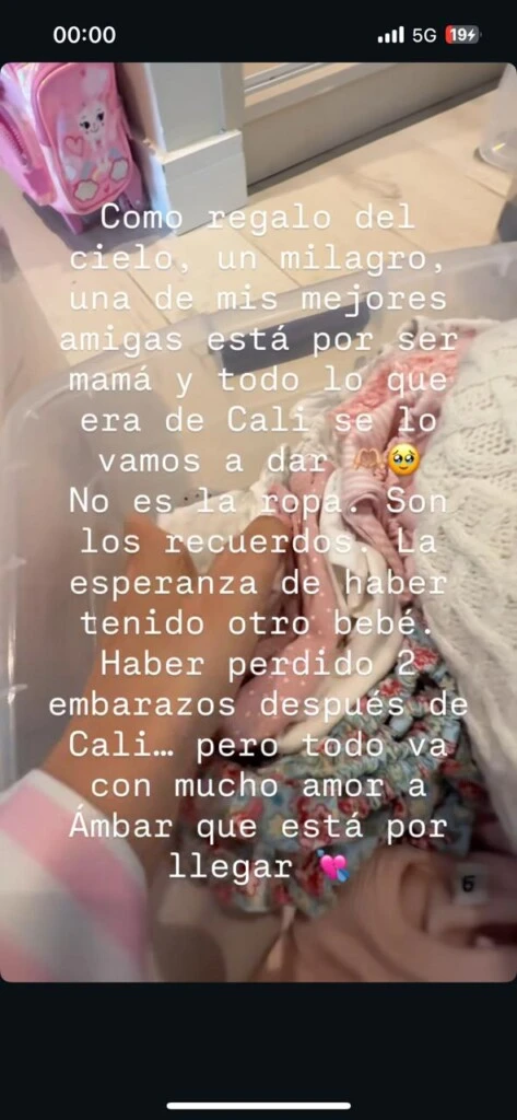 “Como regalo del cielo, un milagro: una de mis mejores amigas está por ser mamá y todo lo que era de Cali se lo vamos a dar. No es la ropa. Son los recuerdos. La esperanza de haber tenido otro bebé. Haber perdido dos embarazos después de Cali… pero todo va con mucho amor para Ámbar, que está por llegar”, expresó conmovida.
