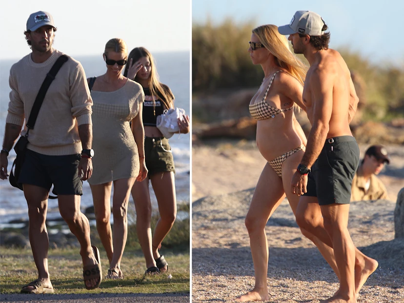 Bellísima, la modelo lució su pancita de cuatro meses de embarazo, vistiendo un traje de baño de dos piezas de diseño damero. Al llegar y también para irse de la playa, completó su look con un minivestido tejido dorado.