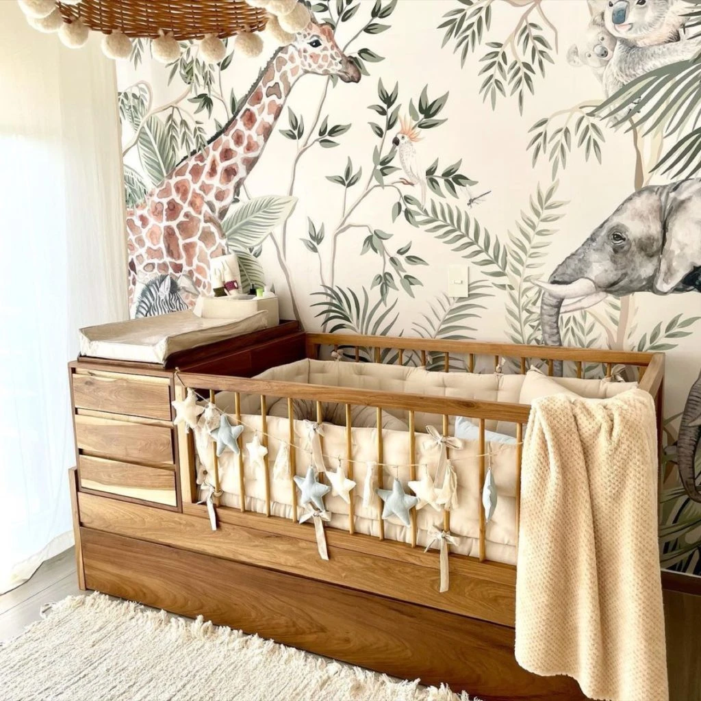 Lo que más se destaca en la habitación es un mural de pared a pared con estampa selvática con animales y mucha vegetación.