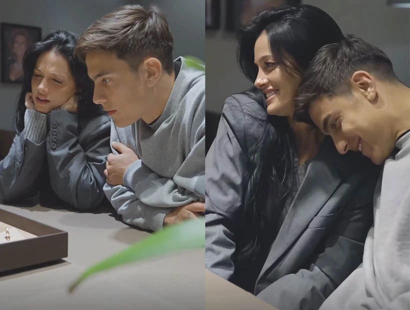 En el video, donde se los ve muy enamorados, Dybala y Sabatini entran a un local y tras sentarse a un escritorio, observan cuidadosamente las alianzas que un joyero les muestra.